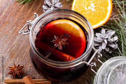 Grzaniec Bożonarodzeniowy z cynamonem, anyżem i plastrami pomarańczy na drewnianym tle