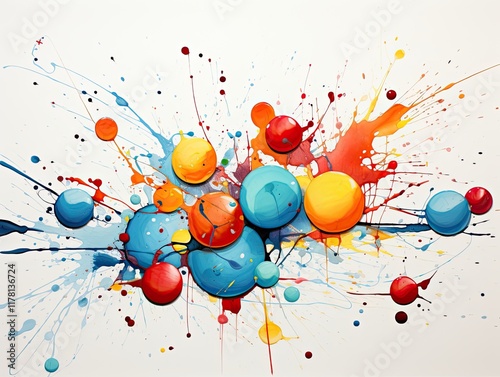 Une explosion vibrante de sphères colorées et de projections de peinture crée une composition artistique dynamique et pleine d'énergie.