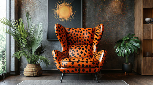 Przytulny dobrze oświetlony salon z fotelem i kwiatami na tle betonowej ściany, tło generative ai
