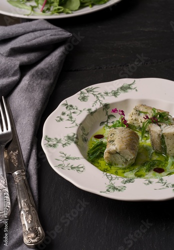 Duszony dorsz z szpinakiem i zieloną oliwą