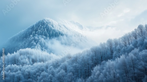 Góra pokryta grubą warstwą lodu, z zamarzniętymi zboczami odbijającymi delikatne światło. W oddali widoczne są drzewa obsypane śniegiem, tworzące krajobraz pełen chłodnego, zimowego piękna.