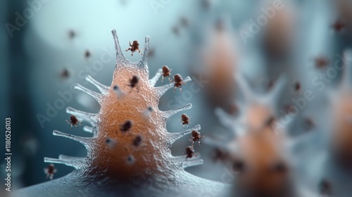 Microscopic view of spiky, translucent cell structures with microscopic entities, evoking biological exploration and the complexity of life.