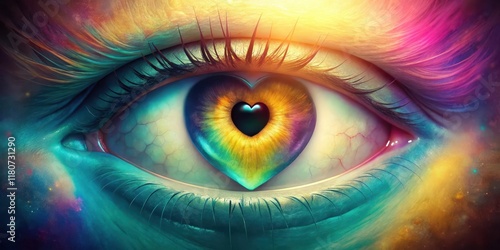 Cosmic Heart's Gaze A vibrant, surreal close-up of an eye featuring a heart-shaped pupil radiating colorful cosmic energy.