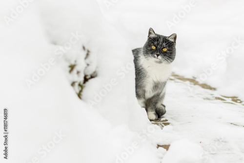 Biało-czarny kot z żółtymi oczami w zimie. Wokół śnieg, kot spaceruje.