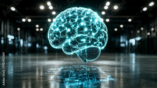 Visualization of an AI chatbot concept, featuring a glowing brain integrated into a sleek digital assistant interface with futuristic design elements
