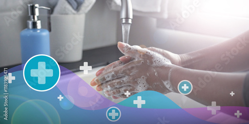 Abstract background. Healthy hand hygiene concept to help prevent germs. Virus, Hand Wash, Soap, Clean, Security, Faucet, Bubble