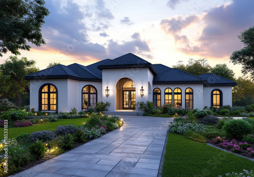 Discover the beauty of this stunning modern home, surrounded by lush gardens and soft lighting, creating a tranquil and inviting atmosphere for any homeowner.
