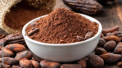 Cocoa powder in a white bowl surrounded by cocoa beans and shells on a rustic wooden background