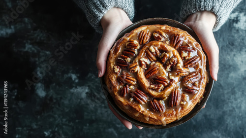 Cozy autumn dessert moment: hands holding glazed pecan pie for holiday gatherings