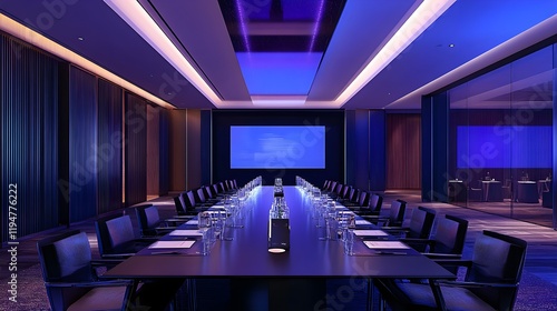 A dynamic business meeting in a sleek, futuristic setting, featuring holographic projections of market trends and innovative concepts, highlighting cutting-edge business solutions.