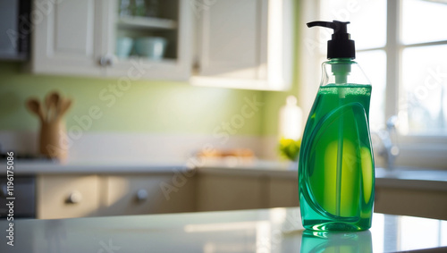 a colorful bottle of dishwashing liquid on a kitchen counter. The bottle has a sleek design with a pump top, and the liquid is a vibrant shade of green.