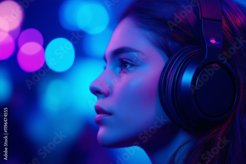 Junge Frau mit Kopfhörern in stimmungsvollem, buntem Licht