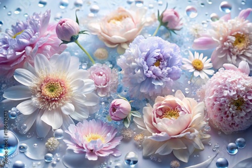 Banner, flyer. Beautiful, airy, delicate floral background in blue and pink tones. Peony flowers, chrysanthemums, daisies with drops of water on their petals.