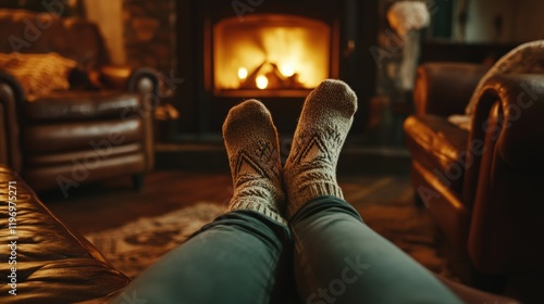 A pair of legs in knitted socks, crossed on a couch in front of a crackling fireplace, creating a cozy home atmosphere.