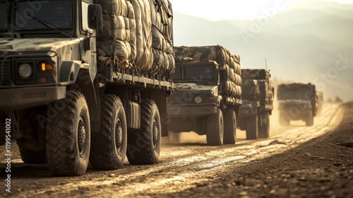 An armored military convoy transporting supplies through a warzone, featuring rugged vehicles with camouflage, supply chains in the military industry,