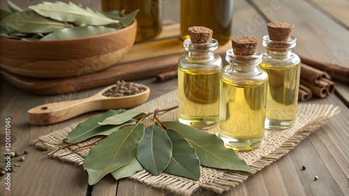 Natural bay laurel essential oil in glass bottles with dried bay leaves on a wooden table. Healthy lifestyle and beauty concepts.