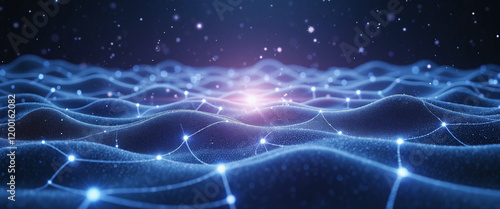 Digital representation of interconnected networks illustrated through luminous blue waves against a dark background evoking a sense of depth and technological advancement