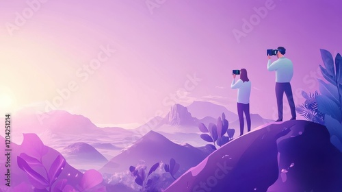 Business people on virtual reality tour 360 watching beautiful landscape and a camera. Virtual tour, 3d reality tours, virtual reality walk concept. Website vibrant violet landing web page template.