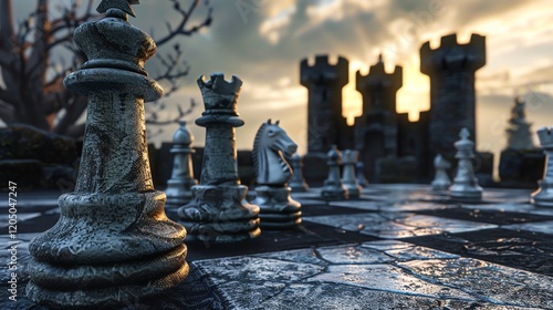 A 3D rendering of a chessboard with black and white pieces. The board is made of stone and the pieces are made of metal.