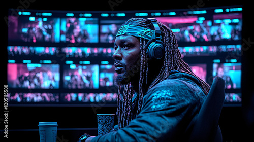 Kreativer Videoeditor bei der Arbeit – Fokus auf Bildschirme mit Filmszenen in futuristischem Studioambiente