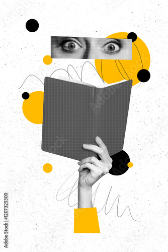 Vertical art banner collage of astonished female eyes hand hold book bookworm hobby reader planner novel on white background