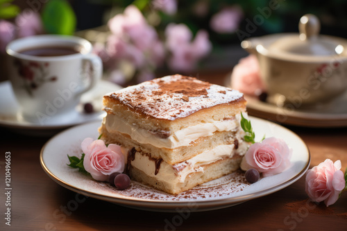 Pyszny kawałek tiramisu podany na porcelanowym talerzu, ozdobiony