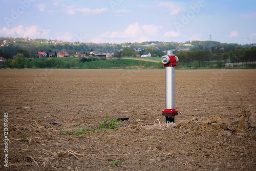 Hydrant do wody wystający z ziemi w tle widać na zielonym horyzoncie dachy domów