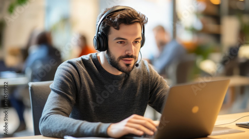 Focused man with headset working on laptop in cafe