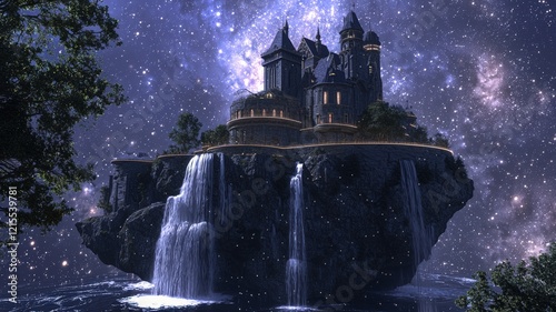 Fantastic Castle on an Island: Majestic Castle with Multiple Towers and Lights, Situated on a Floating Island with Waterfalls and a Starry Night Sky