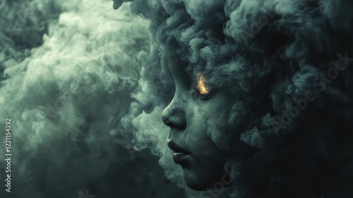 Swirling industrial smoke creating an ominous child's face, Abstract representation of pollution.