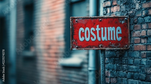 Close-Up of a Weathered Brick Wall with a Vintage Red Metal Sign Featuring the Word 'Costume' in Bold White Letters, Captured Outdoors on a Blurred Urban Background