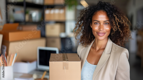 Pewna siebie kobieta trzymająca paczkę w małym biurze