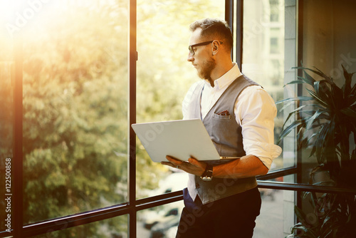 Stylish Bearded Businessman Wearing Glasses White Shirt Waistcoat Holding Modern Laptop Hands Looking Panoramic Window.Man Working Office Startup Project Workplace.Sunset Filter Effect.Blurred.
