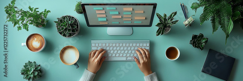 A minimalist workspace with hands typing on a keyboard, sticky notes being added to a board, and coffee cups being set down,