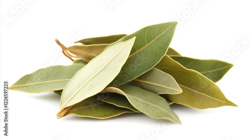 A pile of dry whole bay leaves on white background