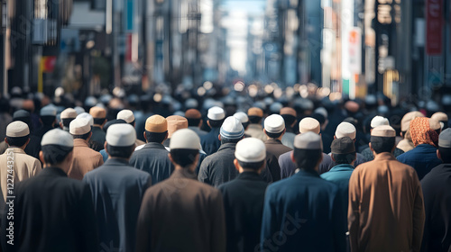 Crowd of Muslim men and women in Tokyo celebrating Ramadan Kareem