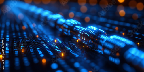 Abstrakcyjny Strumień Danych Cyfrowych Świecący na Niebiesko i Pomarańczowo, Łańcuch Kodów – Cyberpunkowa Wizualizacja Technologii