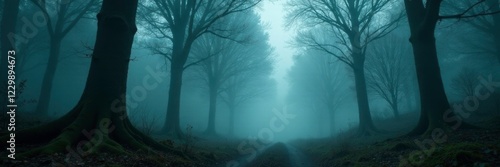 Trees and fog in a mystical forest atmosphere, forest, overgrown, eerie