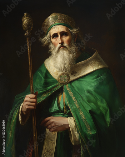 Saint Patrick in green robes holding a staff, classical painting style
