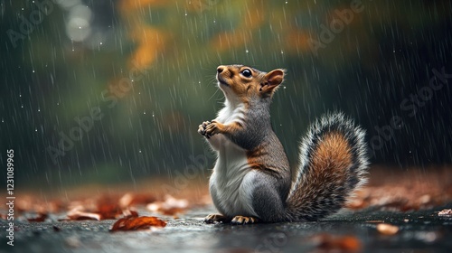 A squirrel looking up at the sky as raindrops begin to fall.