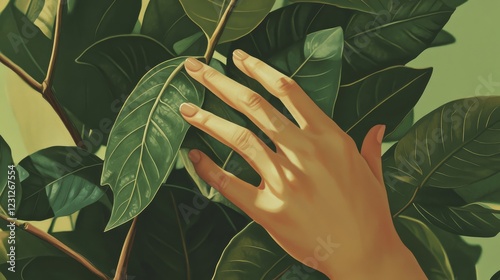 51.A serene moment featuring a woman’s delicate hands adjusting the leaves of a leafy indoor plant, her fingertips softly tracing the veins and edges of the foliage.