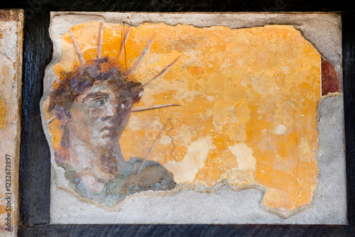 fresco of the deity of the God Apollo or Sol with the cosmic crown and a whip, in the Tavern of the Four Deities in Pompeii, Naples, Campania, Italy, buried by Vesuvius
