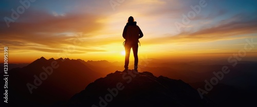 Woman hiker sunset mountain peak achievement