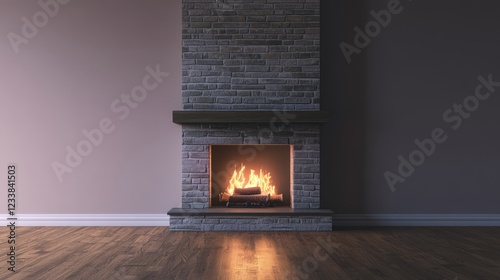 Modern cozy living room featuring a tall stone fireplace with a warm fire and empty copyspace for personalized text or branding usage