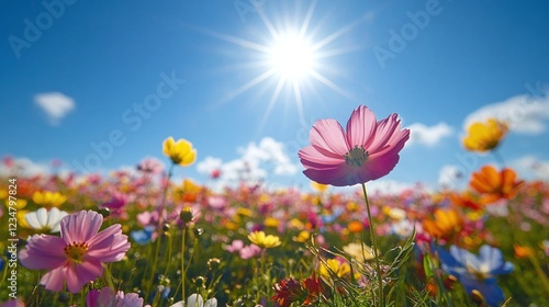 field of flowers in full bloom with the sun setting behind, offering a picturesque outdoor scene of nature’s beauty and the peaceful countryside