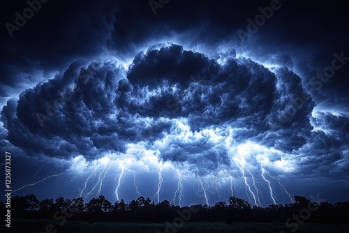 Thunderstorm lightning strikes nature dramatic clouds evening wide angle view weather phenomenon