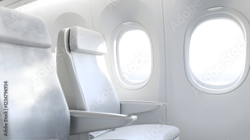 A minimalist airplane seat design featuring sleek white and silver tones with eco-friendly craftsmanship, situated near a window and illuminated by natural light