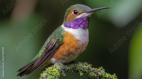 Vibrant hummingbird perched on mossy branch, rainforest background, wildlife photography for nature publications