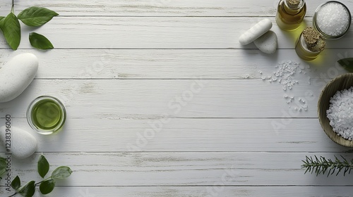Spa essentials: massage stones, oils, and sea salt, embodying relaxation and natural wellnes