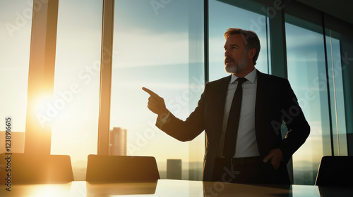 A confident man in a suit stands in a sunlit office, pointing outwards, capturing a moment of decisive leadership and vision.